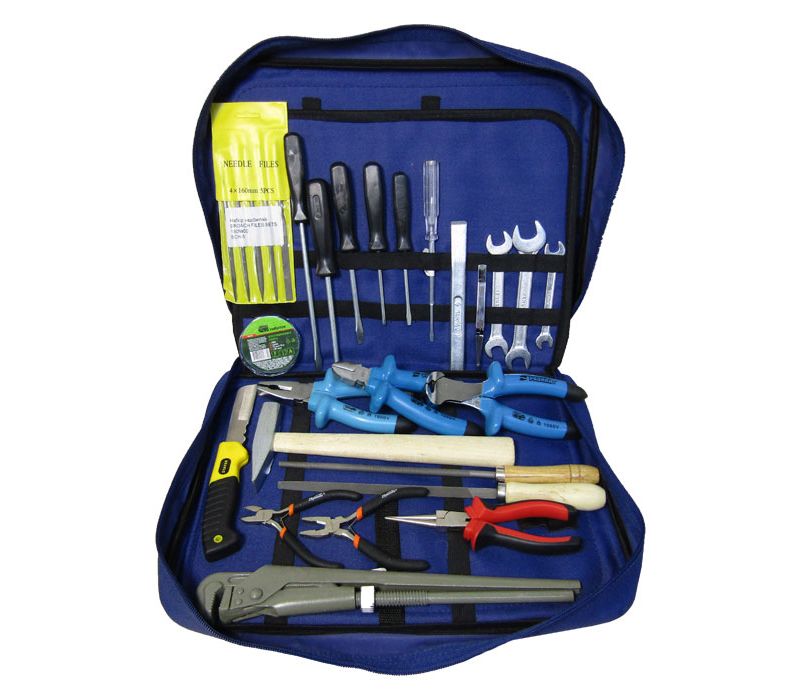 Набор инструментов электрика в сумке состоит из отверток шлицевых, крестовых, напильников, пробника электрического, набора надфилей, круглогубцев, ножа электрика складного, плоскогубцев, кусачек боковых, торцовых, бокорезов, зубила, изоленты ПВХ, ключей гаечных рожковых, пинцета, молотка и ключа трубного.