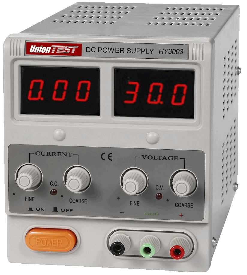 UnionTest HY3003 (прежнее название Mastech HY3003) – источник питания, позволяющий получать регулируемое, точное и стабильное постоянное напряжение или постоянный ток. Две пары регуляторов грубой и точной настройки облегчают установку напряжения и тока, а цифровые светодиодные индикаторы тока и напряжения упрощают считывание параметров выхода.