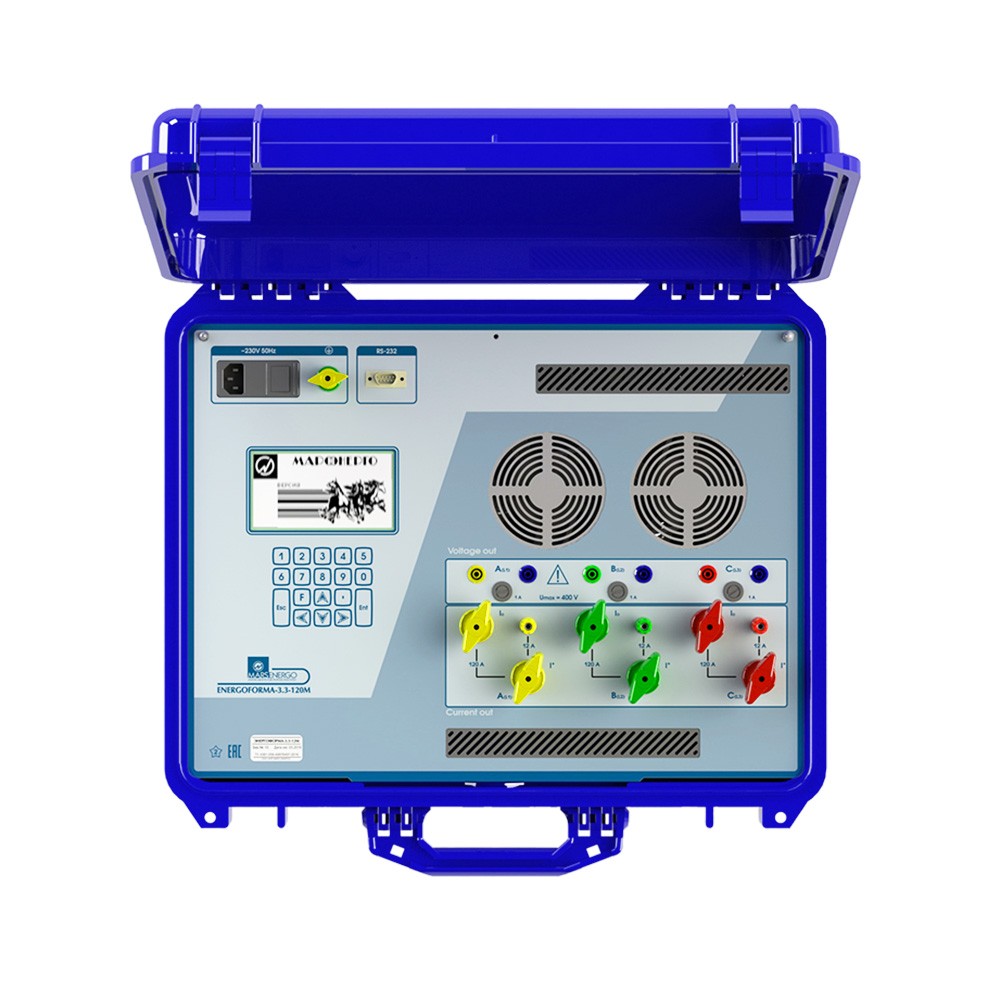 Переносной источник фиктивной мощности, переменного тока и напряжения трехфазный программируемый Энергоформа 3.3-120М осуществляет формирование трехфазной или однофазной системы токов и напряжений в соответствии с программируемой цифровой моделью сигнала при поверке СИ электроэнергии.